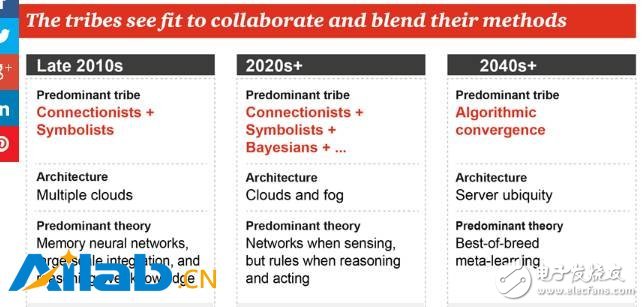 從 2040 年以后,根據(jù)普華永道的預(yù)測(cè),主流學(xué)派將成為 Algorithmic convergence,也即各種算法融合在一起,屆時(shí)機(jī)器自主學(xué)習(xí),也即元學(xué)習(xí)(Meta-learning)實(shí)現(xiàn),計(jì)算服務(wù)將無(wú)處不在。