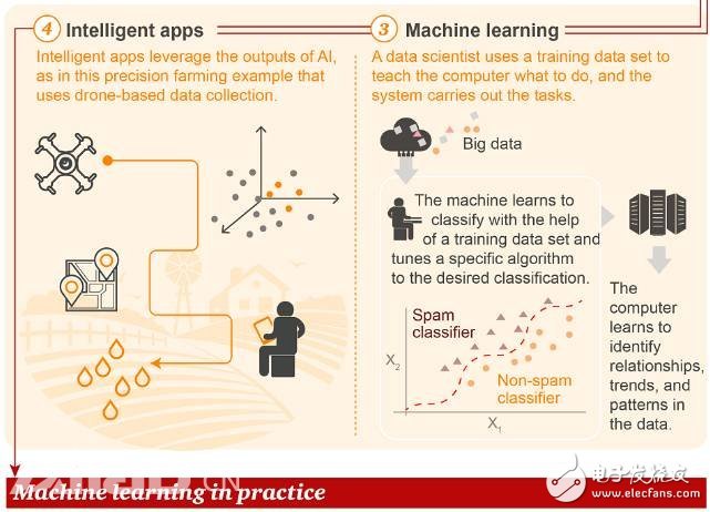 與傳統(tǒng)編程和統(tǒng)計(jì)學(xué)方法不同,在機(jī)器學(xué)習(xí)當(dāng)中,數(shù)據(jù)科學(xué)家使用訓(xùn)練數(shù)據(jù)“教育”計(jì)算機(jī),然后讓計(jì)算機(jī)執(zhí)行任務(wù)。由此,產(chǎn)生了智能應(yīng)用(Intelligent App)。圖中所舉的例子是智能農(nóng)業(yè),通過(guò)無(wú)人機(jī)采集的數(shù)據(jù)進(jìn)行精準(zhǔn)的施肥、灌溉等操作。