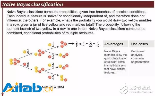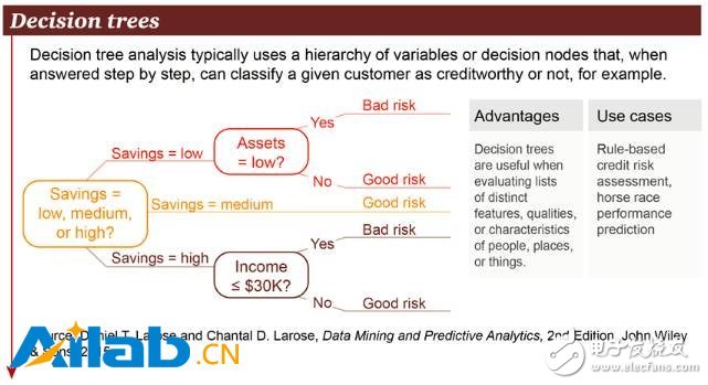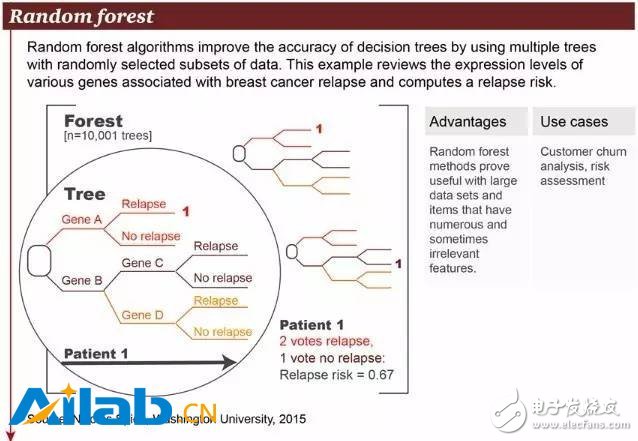 隨機(jī)森林算法結(jié)合了多個(gè)樹,使用隨機(jī)挑選的數(shù)據(jù)子集,以此提升決策樹的分析準(zhǔn)確率。上圖中的例子展示的是與乳腺癌復(fù)發(fā)相關(guān)的不同基因及其幾率。隨機(jī)深林算法的優(yōu)勢(shì)在于能夠處理大規(guī)模數(shù)據(jù)集,以及大量看似不相關(guān)的數(shù)據(jù),可以用于風(fēng)險(xiǎn)評(píng)估和客戶信息分析。