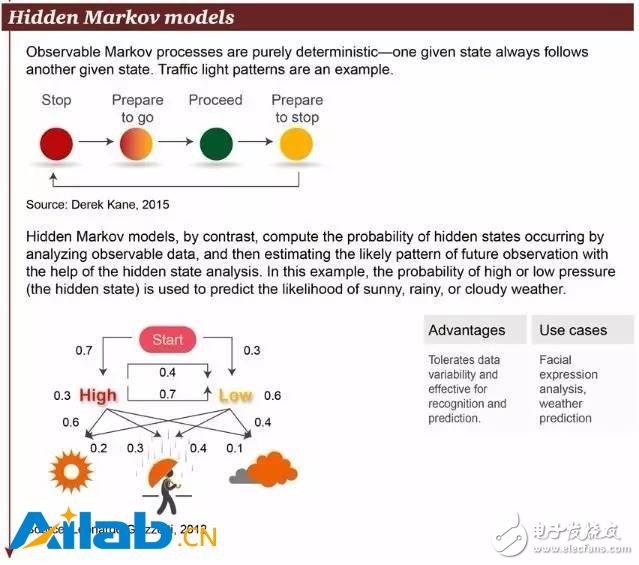 相反,隱馬爾科夫模型通過(guò)分析可觀察的數(shù)據(jù)來(lái)計(jì)算隱藏狀態(tài)的概率,然后通過(guò)分析隱藏狀態(tài)來(lái)估計(jì)未來(lái)可能觀察到的模式。一個(gè)例子是,通過(guò)分析高氣壓(或低氣壓)的概率來(lái)預(yù)測(cè)天氣是晴天,雨天或多云的可能性。
