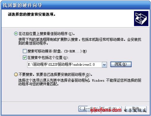 第二步:選擇“在搜索中包括這個位置”,點(diǎn)擊“瀏覽”,定位到配套驅(qū)動光盤的驅(qū)動程序文件夾,如 E:\驅(qū)動程序\XLISP 驅(qū)動程序\USBDRIVER2.0\,進(jìn)入下一步;