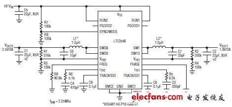 - DN305雙單片降壓穩(wěn)壓器提供兩個(gè)1.4A輸出,帶兩相開(kāi)關(guān)以降低EMI