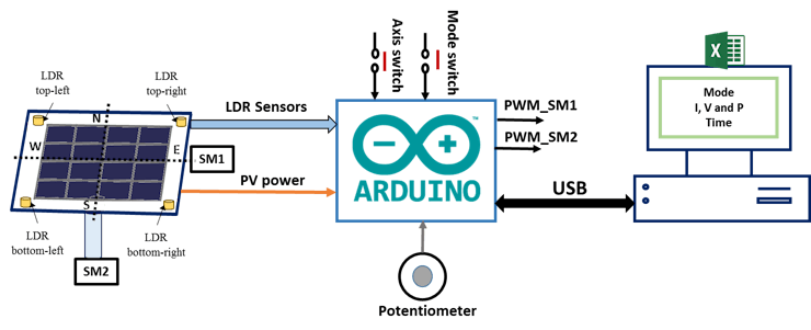 建議的測試臺如圖 1 所示。它基于一個太陽能跟蹤器,該跟蹤器可以借助四個 LDR 傳感器和兩個伺服電機(SM1 和 SM2)自動旋轉(zhuǎn)以跟蹤太陽,或使用電位計手動跟蹤。要在兩種模式(自動和手動)之間切換,使用按鈕。另一個按鈕用于將 SM1(上下伺服電機)或 SM2(左右伺服電機)連接到電位計以控制它們的運動。此外,使用計算機作為虛擬儀器,在 MS Excel 中根據(jù)時間將光伏板的模式和電流、電壓和功率可視化。Arduino Uno 板用于實現(xiàn)系統(tǒng)的所有軟件要求。