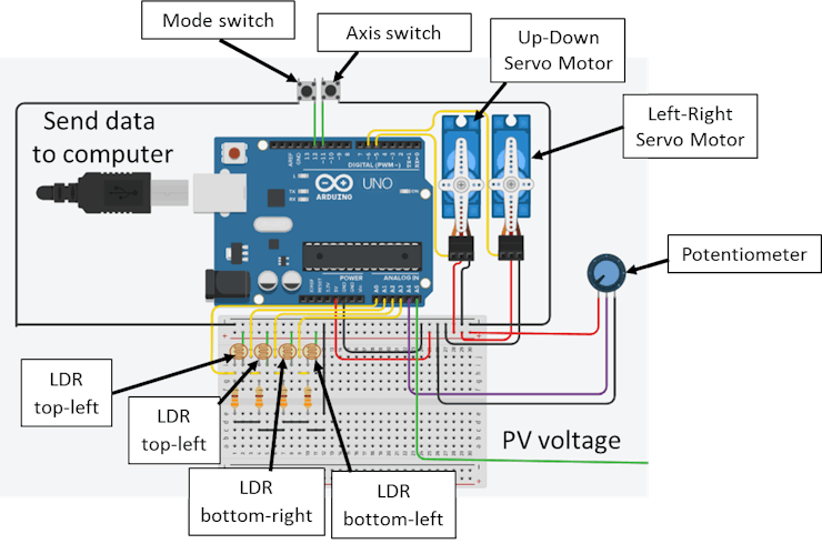 圖 3 展示了所提出的測試平臺的電子電路。對于自動模式,微控制器將 LDR 傳感器(引腳 A0 至 A3)的模擬值轉(zhuǎn)換為數(shù)字。然后,它使用兩個脈沖寬度調(diào)制 (PWM) 信號(引腳 5 和 6)控制兩個伺服電機(上下和左右)來跟蹤太陽。旋轉(zhuǎn)運動發(fā)生在兩個軸上,根據(jù)每日太陽路徑的方位角從東到西,根據(jù)季節(jié)太陽的路徑從南到北高度。對于手動模式,電位器(引腳 A4)用于控制兩個伺服電機的運動,一個按鈕(引腳 11)用于將電位器連接到上下伺服電機或左右伺服電機。此外,另一個按鈕(引腳 12)用于在兩種模式之間切換。此外,PV電壓通過Arduino的模擬引腳A5測量,然后計算PV電流,因為負載的電阻是已知的。接下來,PV 電流、電壓和功率與時間的關(guān)系以及實際模式被發(fā)送到計算機,在 MS Excel 上實時呈現(xiàn)。