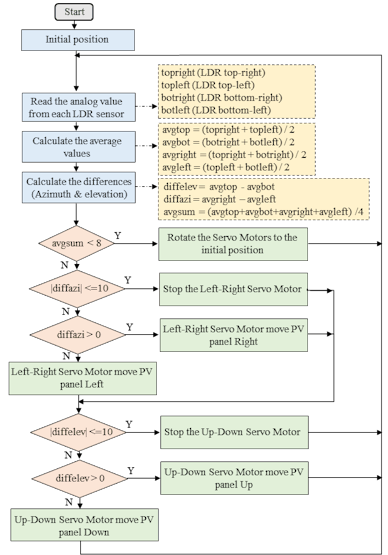 3.如果自動模式處于活動狀態(tài),則將執(zhí)行圖 4 所示的算法。后者使用 LDR 傳感器返回的模擬值。例如,考慮方位角或垂直軸,比較兩個右側(cè) LDR 和兩個左側(cè) LDR 的平均值,如果左側(cè) LDR 接收到更多的光,太陽跟蹤器將通過左右伺服電機沿該方向移動。后者將繼續(xù)旋轉(zhuǎn),直到差異結(jié)果在 [-10, 10] 范圍內(nèi)。該范圍用于穩(wěn)定控制器,一旦太陽能跟蹤器垂直于太陽,則不再進行進一步控制。另一方面,如果右側(cè)的 LDR 接收到更多的光,則太陽跟蹤器通過左右伺服電機沿該方向移動,并將繼續(xù)旋轉(zhuǎn),直到差異結(jié)果在 [-10, 10] 范圍內(nèi)。相同的方式用于高程軸。此外,我們還確定了四個 LDR 傳感器之間的平均輻射,以及該值是否小于一個小值(8:經(jīng)過實際調(diào)整和測試的值,當輻射為零時返回)。也就是說,夜幕降臨了。在這種情況下,太陽跟蹤器必須回到太陽升起的位置。例如,如果將左右伺服電機設(shè)置為 0 度,將上下伺服電機設(shè)置為 30 度,即可到達太陽升起位置。這可以通過 C 函數(shù)“servox. write(angle)”由 Arduino IDE 提供。一個經(jīng)過實際調(diào)整和測試的值,當輻照為空時返回)。也就是說,夜幕降臨了。在這種情況下,太陽跟蹤器必須回到太陽升起的位置。例如,如果將左右伺服電機設(shè)置為 0 度,將上下伺服電機設(shè)置為 30 度,即可到達太陽升起位置。這可以通過 C 函數(shù)“servox. write(angle)”由 Arduino IDE 提供。一個經(jīng)過實際調(diào)整和測試的值,當輻照為空時返回)。也就是說,夜幕降臨了。在這種情況下,太陽跟蹤器必須回到太陽升起的位置。例如,如果將左右伺服電機設(shè)置為 0 度,將上下伺服電機設(shè)置為 30 度,即可到達太陽升起位置。這可以通過 C 函數(shù)“servox. write(angle)”由 Arduino IDE 提供。