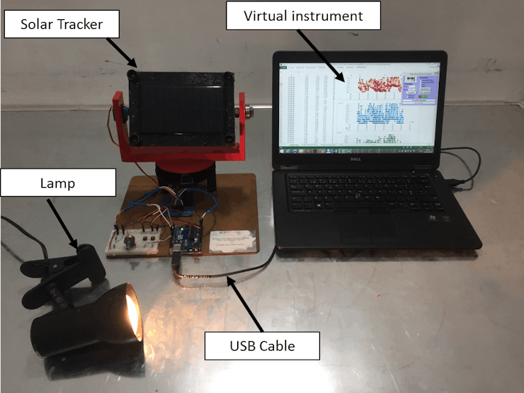 圖 7 顯示了整個測試臺、帶有虛擬儀器的太陽能跟蹤器,以及可以暴露光線以測試太陽能跟蹤器的人造燈。太陽能跟蹤器和計算機通過 USB 數(shù)據(jù)線連接。一旦獲得 PV 電壓,控制器就會處理此信息并使用它來計算 PV 電流和功率。然后,所有這些數(shù)據(jù)都被發(fā)送到計算機以在 MSExcel 中呈現(xiàn)。從無花果。從圖 5 和圖 6 可以看出,所建議的測試臺體積小、靈活且易于使用。它可以讓學(xué)生、研究人員和工程師在實施大型太陽能跟蹤設(shè)備之前以簡單的方式應(yīng)用他們的算法。