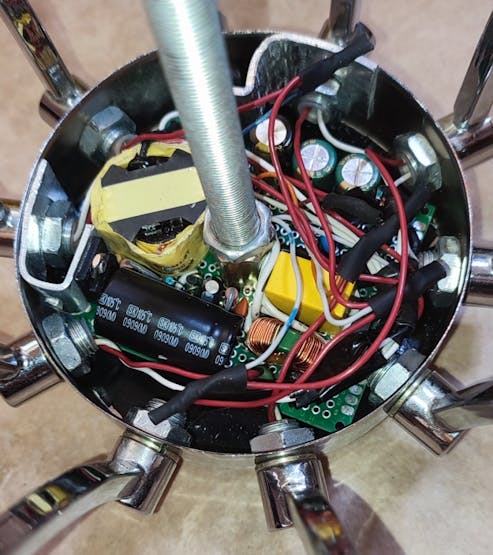 我拆卸了適配器,希望能從中取出電子板并放入枝形吊燈內(nèi)。不幸的是,電路板還是太大了,在詛咒了一段時(shí)間之后,我決定將適配器重新焊接在一個(gè)較小的原型板上,該原型板的尺寸可以適合翻轉(zhuǎn)吊燈。