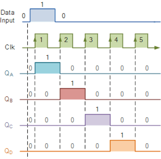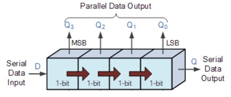 一個移位寄存器通常有三個控制引腳。第一個是時鐘。時鐘在每個時鐘周期通過移位寄存器移位數(shù)據(jù)。第二個引腳是數(shù)據(jù)輸入。該引腳具有將通過移位寄存器移位的邏輯狀態(tài)。觸發(fā)時鐘引腳時,數(shù)據(jù)輸入引腳必須提供正確的數(shù)據(jù)。