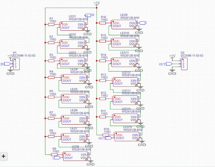 JLCPCB SMT 組件支持最小 10mm 的厚度,所以我將寬度保持在 10mm,然后放置 15 個 LED 以及 100ohms 的限流電阻。然后我找到了 PCB 背層的連接點。