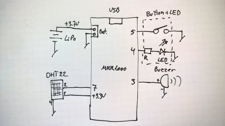這部分是使用Arduino MKR1000設(shè)備構(gòu)建的,該設(shè)備具有內(nèi)置的 wifi 通信和安全功能,可以與云建立安全的 SSL 連接。提供一個簡單的按鈕、一個用于視覺指示的 LED 和一個用于聲音指示的蜂鳴器,所需的額外硬件再簡單不過了。