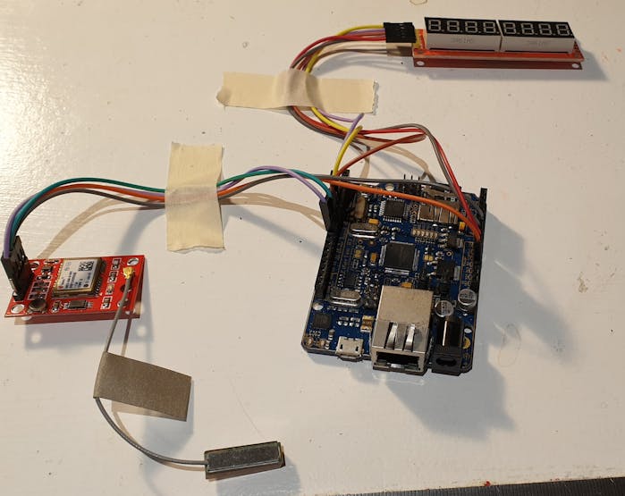 因?yàn)槲覀円呀?jīng)知道我們要走多快,所以添加速度計(jì)顯示也非常容易。大多數(shù)基于 MAX7219 的顯示器都是八位數(shù)字,因此有余地,因?yàn)閷?shí)際上,速度不太可能超過(guò)三位數(shù)字。為此,最左邊的顯示屏顯示當(dāng)前視野中的衛(wèi)星數(shù)量。