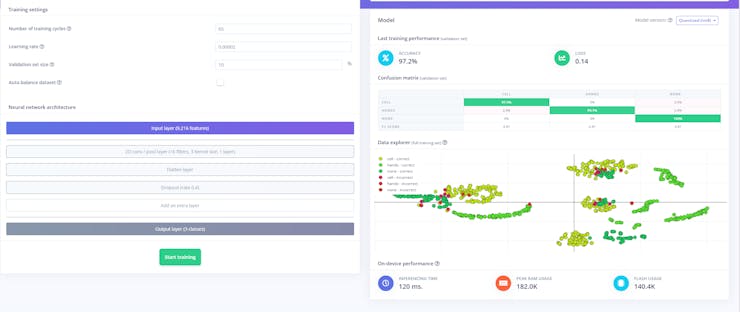 10n2 設(shè)備使用Edge Impulse在 10n2 的核心設(shè)計(jì)模型和訓(xùn)練 CNN。該模型是一個(gè)簡(jiǎn)單的 3 類(手/無(wú)手/細(xì)胞)2D 量化卷積模型。由于 Sony Spresense 的內(nèi)存/計(jì)算限制,我們決定使用簡(jiǎn)單的 CNN。量化是必不可少的,因?yàn)樗鼓P瓦_(dá)到可管理的大小。Edge Impulse 具有易于使用的量化模型方法,以及有關(guān)如何在目標(biāo)硬件上使用量化模型的詳細(xì)說明。