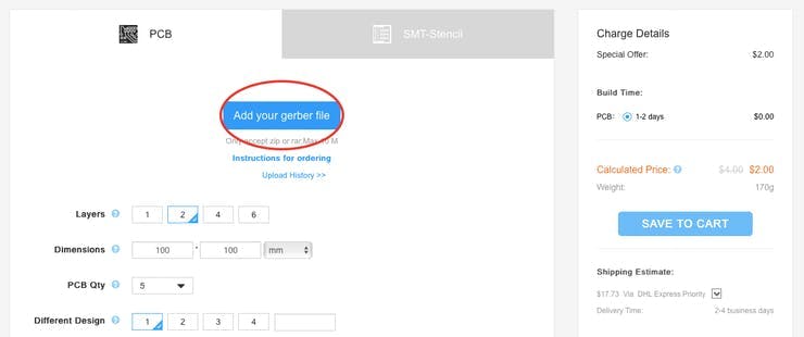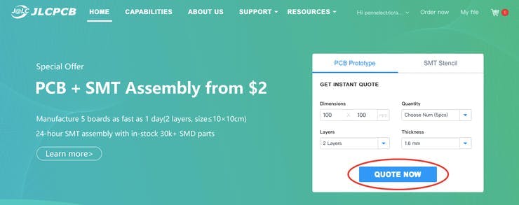 現(xiàn)在,有了我們的 PCB 設(shè)計,是時候訂購 PCB 和組件了。對于此步驟,請前往JLCPCB.com,然后單擊“立即報價”。
