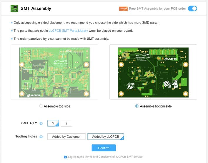 我們選擇讓 JLC 組裝我們 PCB 的底部。對于這一步,我們上傳了從 Altium 導(dǎo)出的 BOM 文件和拾放文件,確認(rèn)了我們從 JLCPCB 的零件庫中選擇的零件,并驗證了我們所有 SMT 零件的方向。