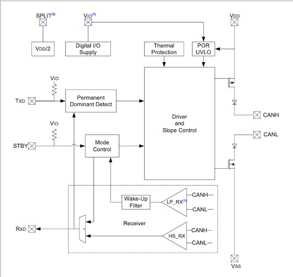 - VIO 電源引腳直接連接到具有 1.8V 至 5.5VI/O 的 CAN 控制器和微控制器