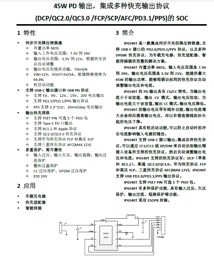 IP6540T 內(nèi)置功率 MOS,輸入電壓范圍是 7.3V到29V,輸出電壓范圍是3.3V 到21V,能提供最大45W 的輸出功率,能夠根據(jù)識別到的快充協(xié)議自動調(diào)整輸出電壓和電流。