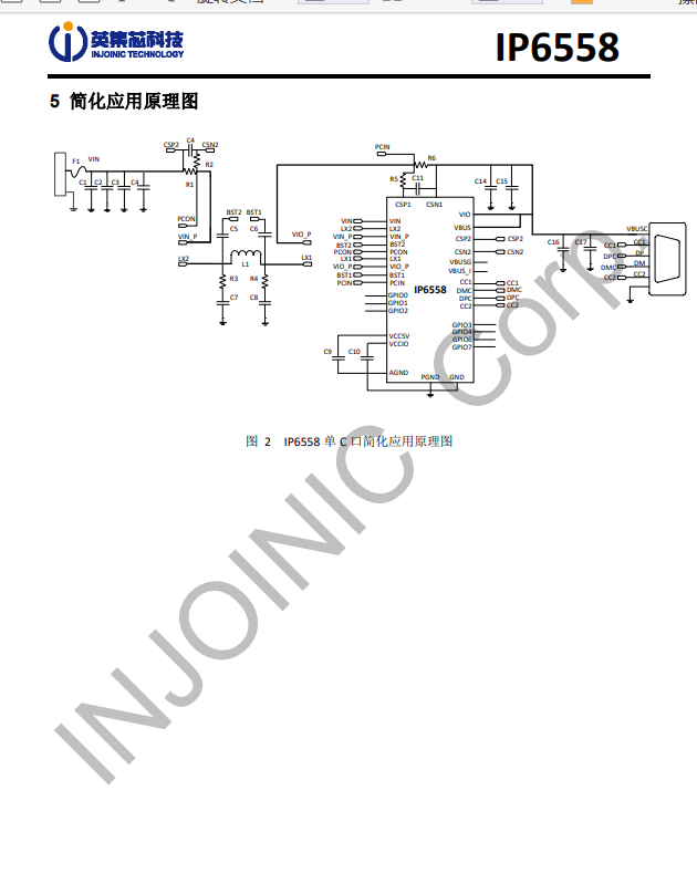 IP6558集成多種保護功能,具有輸入過壓,欠壓保護,輸出過壓,欠壓,過流,短路保護,過溫保護等功能。