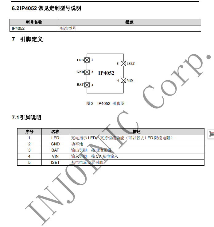 IP4052 支持 ISET 腳外接電阻設(shè)置充電電流。 IP4052 采用 SOT23-5 封裝。