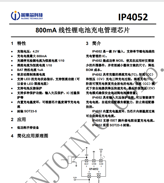 IP4052 是一款 5V 輸入,支持單節(jié)鋰電池線(xiàn)性充電管理的 IC。