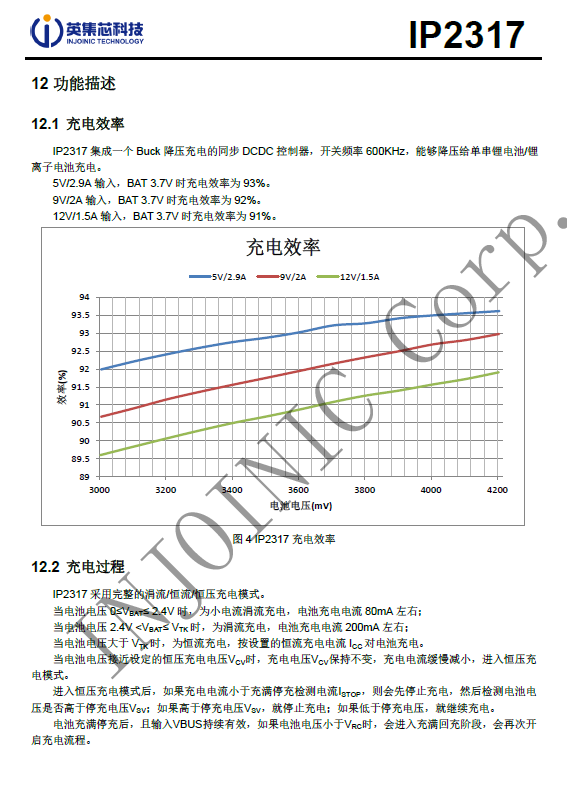 IP2317 輸入電壓范圍 5V~12V,降壓開關(guān)充電轉(zhuǎn)換器工作頻率 600KHz;在 VIN=12V,BAT=3.7V, IVBUS=1.5A 時,效率 91%;