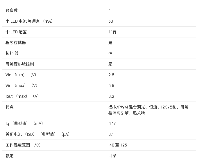 ? 1. 核心特性 ? ? 多通道驅(qū)動(dòng) ?:4通道恒定電流輸出,支持RGBW LED,單通道電流范圍0.1mA至51mA(8%設(shè)備間誤差,3%通道間誤差...