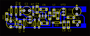 元器件選擇與制作 VT1可用9014,VT2用9018,要求放大倍數(shù)要大于80;VT3選用8050C或者3DG12C,要求放大倍數(shù)要大于50。 C1、C3、C11采用電解電容,C4~C10為瓷片電容,電阻采用碳膜電阻,L1~L3用直徑為0.4mm的漆包線在圓珠筆芯上繞6匝,然后脫胎取下即可。L1應(yīng)在3雜處抽頭,L2與L3在印刷電路板上應(yīng)互相呈垂直狀態(tài)排列。天線最好采用拉桿天線,也可以采用800毫米長(zhǎng)的塑料軟線代替。 印刷電路板圖如下圖(點(diǎn)擊可以放大),注意:印刷電路板上沒(méi)有設(shè)有開(kāi)關(guān)S,需另外接。