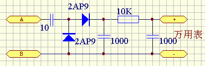 電路安裝好以后要進(jìn)行調(diào)試,調(diào)試可以分三步進(jìn)行: 1、調(diào)整各級(jí)工作點(diǎn):調(diào)電阻R3使VT1的集電極電壓為1.5V(或集電極電流為1毫安左右);調(diào)整電阻R7使VT2的集電極電流為4到6毫安左右,此時(shí)用鑷子觸碰VT2的集電極,此電流應(yīng)有明顯變化,說(shuō)明高頻振蕩器工作正常。VT3的工作點(diǎn)不用調(diào)試。 2、頻率調(diào)整:打開(kāi)調(diào)頻收音機(jī),在88~108Mhz范圍內(nèi)搜索本機(jī)信號(hào)。如兩機(jī)頻率對(duì)準(zhǔn),收音機(jī)里會(huì)產(chǎn)生劇烈的嘯叫聲,此點(diǎn)應(yīng)避開(kāi)當(dāng)?shù)氐恼{(diào)頻廣播電臺(tái)所使用的頻率,避開(kāi)方法是用小螺絲刀撥動(dòng)線圈L1的匝距。 3、發(fā)射場(chǎng)強(qiáng)調(diào)試:先自制一個(gè)簡(jiǎn)單的場(chǎng)強(qiáng)儀,電路如下圖。將場(chǎng)強(qiáng)儀的A、B兩點(diǎn)分別接無(wú)線話筒的天線端和地端,微調(diào)無(wú)線話筒的L2和L3的匝距,使場(chǎng)強(qiáng)儀的萬(wàn)用表讀數(shù)最大即可。場(chǎng)強(qiáng)儀萬(wàn)用表應(yīng)置于直流10V或50V檔。 調(diào)整好的電路即可投入使用。 |