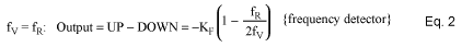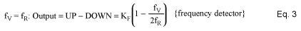 Equations 1, 2 and 3 phase/frequency detector transfer functions when inputs are at the same frequency (lock condition) and at dissimilar frequencies (fV > fR and fV < fR respectively).where:![]()
