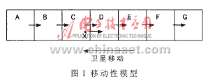 目前已提出很多適用于LEO星座通信系統(tǒng)仿真分析的移動性模型[4-5],本文采用圖1中所描述的一維移動性模型[4]。其中,A-G為衛(wèi)星多波束天線在地面上形成的彼此相連的方形小區(qū)。假設(shè)這些方形小區(qū)固定不動,小區(qū)中所有用戶以相同的速度沿著與衛(wèi)星相反的方向運(yùn)動,速度大小與衛(wèi)星星下點(diǎn)速度相等。模型假設(shè)用戶配置有定位系統(tǒng),則在呼叫開始時用戶的位置就被確定。對于明確了移動速度、方向和位置的用戶,其即將穿越的下一小區(qū)和切換的時間是可以預(yù)測的。