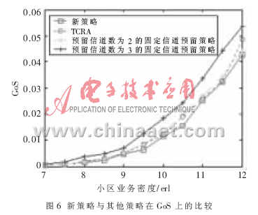 本文在固定信道分配的基礎(chǔ)上,分別采用了TCRA、基于TCRA的強(qiáng)占預(yù)留信道策略、預(yù)留信道數(shù)量為2和3的固定信道預(yù)留策略對通信過程進(jìn)行仿真。對應(yīng)不同的業(yè)務(wù)量,對幾種策略的切換失敗概率、新呼叫阻塞概率和GoS三項指標(biāo)進(jìn)行比較, 如圖4、圖5、圖6所示對比幾種策略,TCRA不產(chǎn)生切換失敗,這是此算法的優(yōu)勢,但其產(chǎn)生的新呼叫阻塞率較高;固定預(yù)留2個信道策略的切換失敗率最高;固定預(yù)留3個信道策略的新呼叫阻塞率最高;提出的新策略產(chǎn)生一定的切換失敗,但即使是在業(yè)務(wù)量為12愛爾蘭時切換失敗率也僅有7.7×10-4,在新呼叫阻塞概率方面,明顯優(yōu)于固定預(yù)留3個信道的預(yù)留策略和TCRA策略,對應(yīng)不同的業(yè)務(wù)量,策略幾乎都能比TCRA降低20%的新呼叫阻塞概率。幾種策略中,本文提出的新策略具有最低的GoS。綜上,與TCRA和兩種固定信道預(yù)留策略相比,新策略都具有更好的QoS,且能較好地利用系統(tǒng)的信道資源。