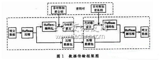 一個高效的數(shù)據(jù)傳輸系統(tǒng)必須保證數(shù)據(jù)在傳輸中的安全和可靠,包括信息的保密性、完整性,同時在實現(xiàn)數(shù)據(jù)傳輸中占用更少的資源。所以數(shù)據(jù)加密傳輸?shù)姆桨钢袘?yīng)包括對發(fā)送端數(shù)據(jù)的有效加密、密鑰的分配、傳輸數(shù)據(jù)的壓縮。下面主要從信息的壓縮、保密性幾個方面來考慮數(shù)據(jù)加密傳輸系統(tǒng)中的加密方案。