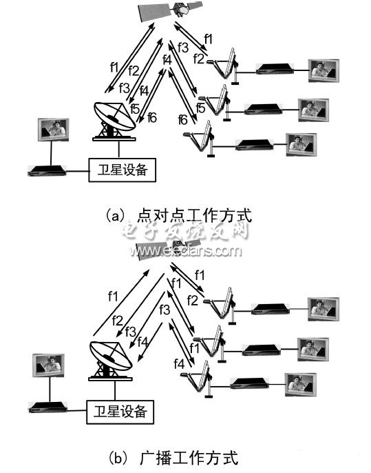 舉例說明: 一個衛(wèi)星視頻會議系統(tǒng)包含1 個中心站和3 個遠(yuǎn)端站。若采用點對點方式,中心站圖像信息需要3 個載波發(fā)給3 個遠(yuǎn)端站,加上3 個遠(yuǎn)端站的回傳圖像,共需6 個載波圖3( a) 中f1~ f6; 但若采用廣播方式通過1 個載波將中心站信息同時廣播給3 個遠(yuǎn)端站,則可節(jié)省2 個載波,全網(wǎng)只需4 個載波圖3( b) 中f1~ f4。若所有載波大小一致,則全網(wǎng)可節(jié)省1/3的衛(wèi)星資源,資源利用率大大提高。同時由于中心站由多載波工作方式更換為單載波方式,不需要考慮消除多載波交調(diào)影響采取的功率回退措施,可以降低射頻設(shè)備功率指標(biāo),圖3( b) 所需功放功率只有圖3( a) 工作方式時的1/6,因而可以降低建站成本。