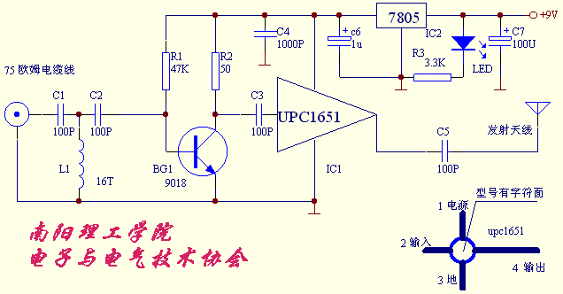 電路如圖下圖所示: 這個電路的工作原理是射頻信號經(jīng)75歐姆射頻電纜送至有C1、 L1、C2 構(gòu)成的高通濾波器,將低于45MHZ的頻率濾除,然后在經(jīng)三極管9018等組成的前置放大 器放大后由電容C3送至upc1651進行功率放大,其輸出信號經(jīng)60cm左右的鞭狀天線發(fā)射 出去。7805等構(gòu)成穩(wěn)壓與電源指示為upc1615提供5V的供電。