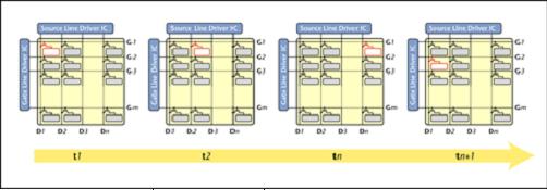 上圖為各畫素點指定的時間變化﹐由t1到tn閘極驅動IC持續(xù)選擇開啟G1﹐使得源極驅動IC以D1、D2到Dn的順序對G1上的TFT畫素充電。tn+1時﹐閘極驅動IC再度選擇G2﹐源極驅動IC再D1開始依序選擇。