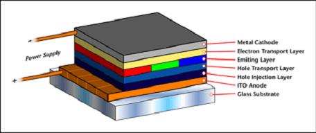 其發(fā)光原理,系在透明陽極與金屬陰極間蒸鍍有機薄膜,注入電子與電洞,并利用其在有機薄膜間復合,將能量轉成可見光。并且可搭配不同的有機材料,發(fā)出不同顏色的光,來達成全彩顯示器的需求。