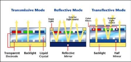 " 反射式 "架構經(jīng)由反射板之裝置利用外部光源來顯示畫面﹐此裝置省電但在缺乏外部光源是就較難看到畫面。
