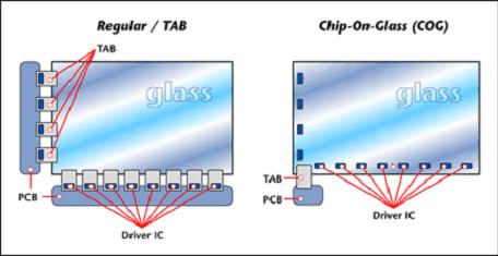 不同于傳統(tǒng)制程﹕COG技術將驅動IC直接假設于玻璃基板上﹐此技術之優(yōu)點包含有: