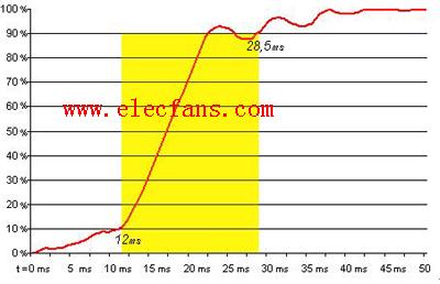 如上圖所示的某液晶顯示器響應(yīng)時間測試數(shù)據(jù),按照ISO定義上升沿時間為28.5-12 = 16.5 ms。但我們觀察整個像素從0%灰度到100%灰度轉(zhuǎn)化的全部過程,實際用時超過了40 ms,達到ISO定義所用時間的兩倍多。