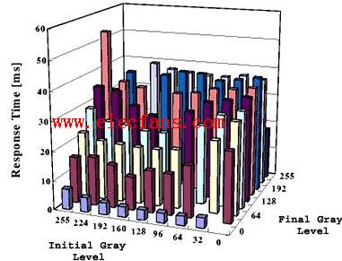 當然ISO定義的缺陷還不止如此,其中最為嚴重的是忽略了色彩變化時——即不同灰度切換的時間,這也是我們?nèi)粘J褂蔑@示器是最多的顯示狀況。從液晶的顯示原理來說,當一像素從較淺灰度轉(zhuǎn)變?yōu)檩^深灰度時,其加在像素兩端電極電壓也響應(yīng)加強。但是和ISO規(guī)范中定義的黑白黑切換的最大激勵電壓相比,在灰度切換時相應(yīng)的施加電壓要低得多,因此在這種情況下液晶分子反轉(zhuǎn)響應(yīng)的速度也會變慢。同理,當色階從較深灰階到淺灰階轉(zhuǎn)變時,過程相反,不過此時淺色灰階對應(yīng)的電極電壓也不為零,相應(yīng)的電壓差激勵效果也會變差,下降沿時間也會變長。