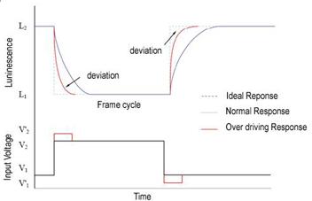如上圖所示,在上方的藍色曲線表示正常情況液晶分子加電壓后的反應(yīng)過程,相應(yīng)的電壓情況由下面的黑色直線表示。我們看到從施加電壓開始到液晶分子穩(wěn)定并不是一個一成不變的過程,而淡藍色的點線則表示液晶追求的理想響應(yīng)。Overdrive以及 ClearMotiv 和一般液晶觸發(fā)的過程就在于輸入電壓階段,我們可以看到,為了讓液晶分子達到更快的反應(yīng)速度,在初始階段會比以一般狀態(tài)下施加更高的激勵電壓,待到液晶分子方向趨于目標方向時,激勵電壓恢復(fù)目標灰階水平。