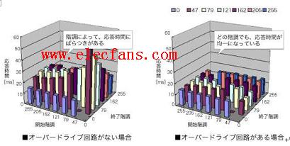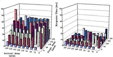 我們可以看看當時NEC發(fā)布的研究報告中的圖表,該表左邊是沒有采用FFD技術(shù)時測得的響應(yīng)時間空間分布圖,而右側(cè)則是采用FFD技術(shù)后的測試成績,我們看到,尤其是在灰階轉(zhuǎn)換的過程中,最大的改善成績從55ms左右縮小到6 ms。而我們要注意的是,左右兩圖在單純的白-黑-白響應(yīng)時間并沒有變化,我們可以這樣理解,因為在純白到純黑的過程中電極施加的激勵電壓已經(jīng)是最大值了,所以沒有改善是在情理之中的。雖然NEC并沒有把這一技術(shù)應(yīng)用在顯示器領(lǐng)域(因為該技術(shù)的出發(fā)點就是為了改善液晶電視的響應(yīng)速度問題),但是從去年下半年和FFD技術(shù)有著相同技術(shù)原理的 Overdrive技術(shù)開始在中高端液晶顯示器上流行開來。