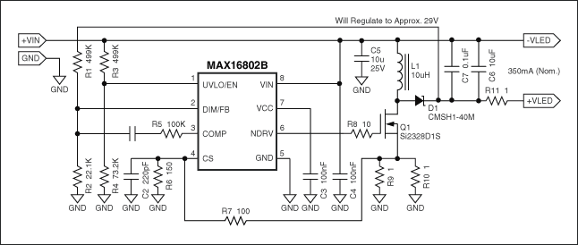 836 MAX16801引腳UVLO/EN的喚醒門限電壓是1.28 V,該引腳電壓只有超過1.28 V,電路才能開始工作。電阻分壓器(R2與R3)可用作編程輸入啟動(dòng)電壓。基于MAX16801的離線非隔離回掃式 LED驅(qū)動(dòng)器電路 :