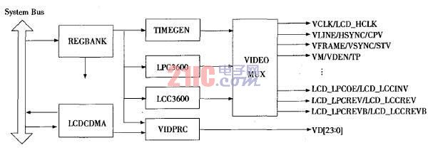 ??? LCD控制器主要由REGBANK、LCDCDMA兩大部分組成,用于產(chǎn)生必要的控制信號(hào)和傳輸數(shù)據(jù)信號(hào),如圖2所示。REGBANK有17個(gè)可編程寄存器組和256×16的調(diào)色板存儲(chǔ)器,用來設(shè)定LCD控制器。LCDCDMA 是一個(gè)專用的DMA(Direct Memory Access),自動(dòng)從幀存儲(chǔ)器傳輸視頻數(shù)據(jù)到LCD控制器,視頻數(shù)據(jù)可以不經(jīng)CPU處理直接顯示在屏上。TIMEGEN 由可編程邏輯器件組成,產(chǎn)生VFRAME/VSYNC、VLINE/HSYNC、VCLK/DCLK、VM/VDEN信號(hào)等,以支持不同的LCD驅(qū)動(dòng)器的接口時(shí)序和速率。LPC3600與LCC3600是專用LCD控制器,在此不做詳細(xì)介紹。