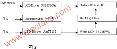 STN -LCD彩屏模塊的電路結構如圖2所示,外來電源Vcc經(jīng)LDO降壓穩(wěn)壓,向LCD驅(qū)動IC如三星的S6B33BOA提供工作電壓,驅(qū)動彩色STN- LCD的液晶顯示圖形和文字;外來電源Vcc經(jīng)電荷泵升壓穩(wěn)壓,向白光LED如99-21UWC提供恒定的恒壓、恒流電源,LED的白光經(jīng)背光板反射,使 LCD液晶的65K色彩充分表現(xiàn)出來,LED的亮度直接影響LCD色彩的靚麗程度。