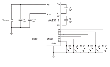 分數(shù)倍頻升壓的電容式電荷泵如AAT3113,有4-6路恒流輸出,每路能輸出20mA電流,單個恒流驅(qū)動LED,具有32級調(diào)光功能,如圖4所示。AAT3134將輸出DAC模塊分成二塊,其輸出可分別驅(qū)動雙屏顯示的大小LCM模塊。