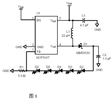NCP5009是帶光敏傳感器的背光LED驅(qū)動升壓器,適用于自動調(diào)光的高檔手機LCM,對LED串聯(lián)驅(qū)動,如圖5所示。NCP5007是可恒流驅(qū)動5顆串聯(lián)的LED、PWM調(diào)光的背光LED驅(qū)動升壓器,如圖6所示。