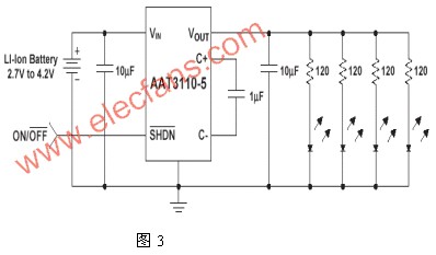 倍頻升壓的電容式電荷泵如AAT3110,5V恒壓輸出,最大電流120mA,并聯(lián)驅(qū)動LED,如圖3所示。