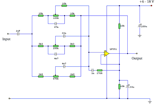這款3頻段圖形均衡器的主要部件是美國國家半導體公司生產(chǎn)的LM833。LM833具有非常低的噪聲,頻段/放大器為15MHz,上升速度為7V/s。低頻的截止點為200Hz,高頻的截止點為2kHz。最大衰減為16dB。該聲音均衡器的總增益為0dB,但可以通過改變R2來改變。