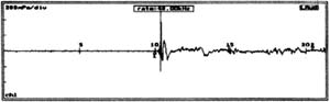 圖2、情況與圖1相同,但是在高音單元的地面和天花板上的“鏡像反射點(diǎn)”放置了10CM厚的0.6X0.6M的泡沫塊。由于泡沫的吸聲,脈沖信號后2-3MS處的尖峰以消失。