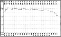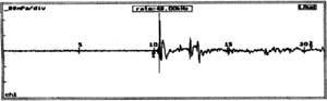 圖3、在聆聽位置上,頭5mS中某時刻的頻率響應(yīng)。在Spendou SP1/2音箱上輸入以脈沖信號時并在天花板的反射點(diǎn)上貼有泡沫。除地面鋪設(shè)有地毯外,未對聽音室進(jìn)行任何處理。注意5mS窗口的低頻滾降,隨著頻率的增加,高頻段也有些衰減。留意400Hz-8KHz的一段。